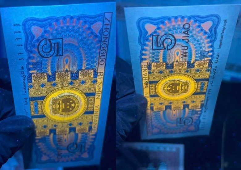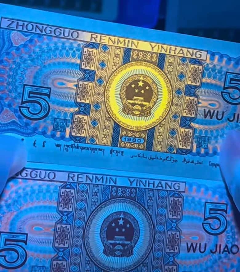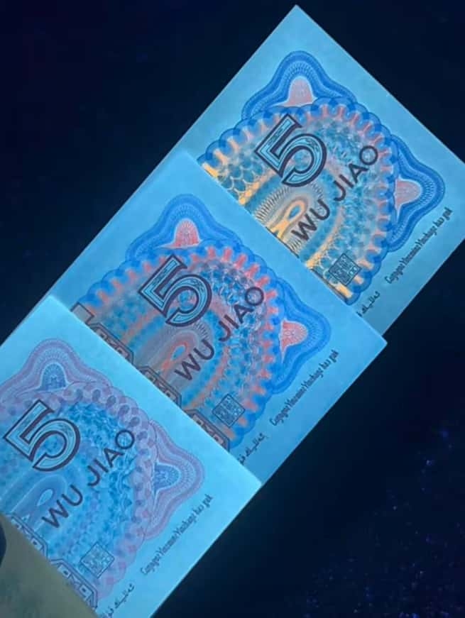 或者以中间荧光叠加右边耳朵荧光,或者中间荧光叠加左边耳朵荧光二者占百分二十左右。而所谓真正满版中国红的荧光形态是票面背面在荧光灯下无任何遮挡国徽的动作,背面整体票面荧光显著!才叫一眼清满版中国红。