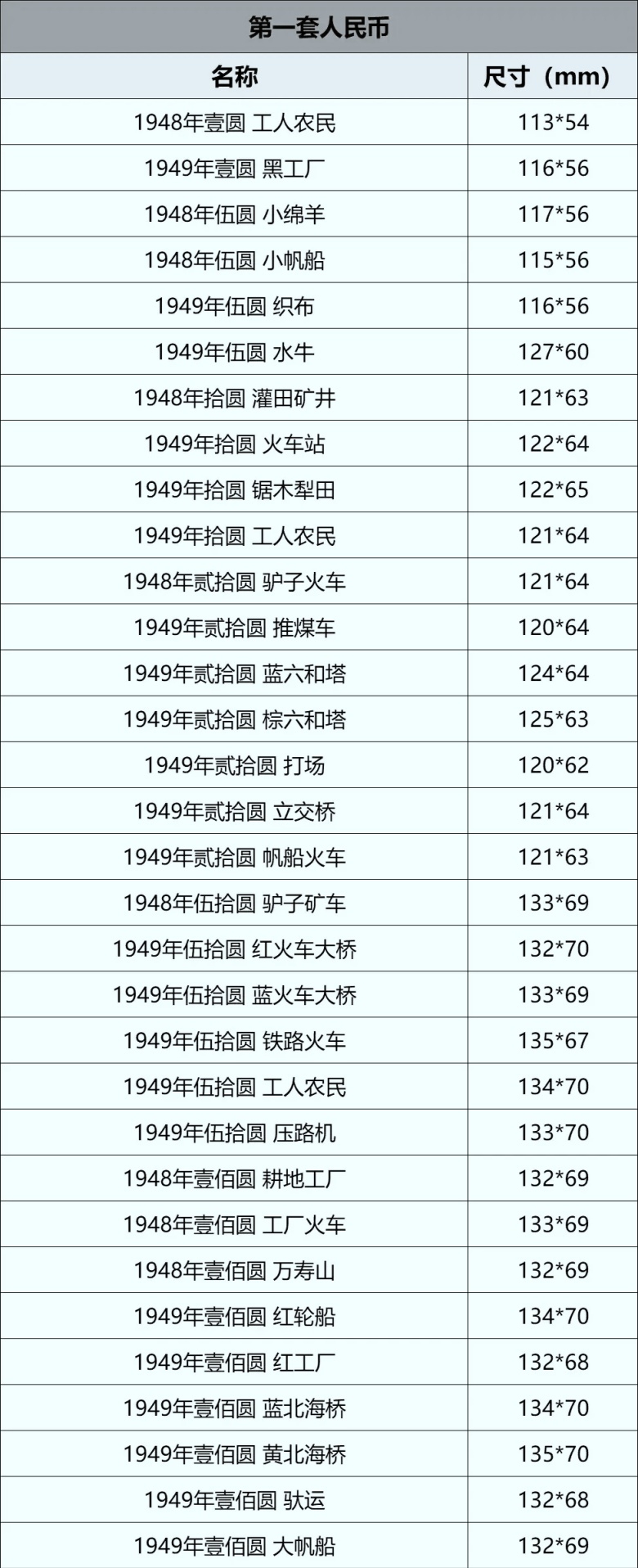 1. 第一套人民币版别繁多,本表仅列常见版别尺寸,部分同面值不同版别尺寸略有差异,以实物为准。