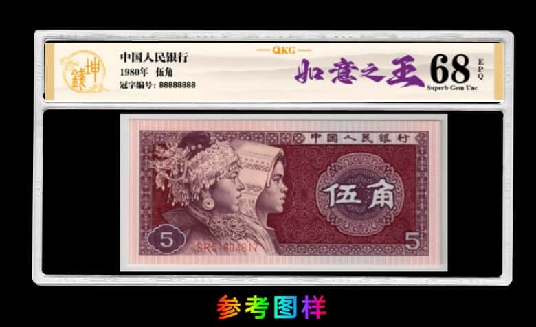 标签图样 申请纸币版本:四版伍角(8005) 申请版本名称:【如意之王】(油墨版本) 冠号参考信息:SR5406 效果以上 具体按照实际效果添加 形态特征:至尊红如意是8005重油墨的开山鼻祖,其效果也是十分震撼,无需借助其他工具肉眼可见一眼清,至尊红如意是钱坤…