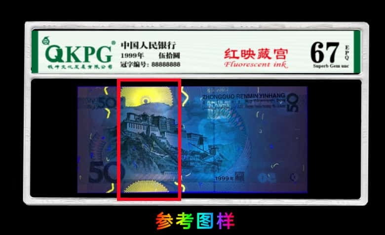 钱坤评级【红映藏宫】标签图样 申请纸币版本:第五套人民币伍拾圆券(简称:9950) 申请版本名称:【红映藏宫】(荧光版本) 冠号参考信息:开标冠号GF 后期陆续更新。 形态特征:红映藏宫是9950背面荧光的又一发现,特征为背面布达拉宫位置上下呈现粉红色荧光油墨,故名“红映藏宫”。经…