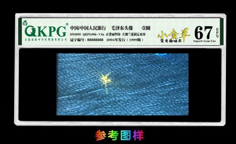 钱坤评级【小金羊】标签图样 申请纸币版本:第五套人民币壹圆券(简称:991) 申请版本名称:【小金羊】(荧光版本) 冠号参考信息:开标冠号Z***P后期陆续更新。 形态特征:新标“小金羊”是荧光趣味币细分版本,主要特征在纸币背面西湖位置有一处金色荧光油墨(漏墨)形态和“羊”字极为相似,…