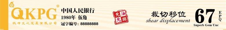 标注参考信息:钱坤评级评定分数沿用70分制国际通用标准,评分以严谨公正为基础,鉴定组经过长时间的研究发现,中国纸币在使用国际标准评定的基础上有些标准并不完全适用,特别是第四套人民币设计特殊,所以在印刷裁切过程中出现裁切偏移情况较为多见,按照国际标准评定裁切移位最高65E并不适用,应根据中国纸币的实际特征给予更适用的评分标准。经过钱坤评级鉴定组表决通过,现将原有裁切移位最高65E修改为67E并同时标注裁切移位。