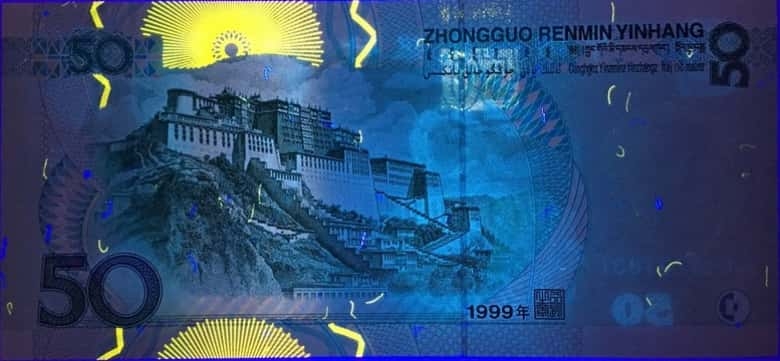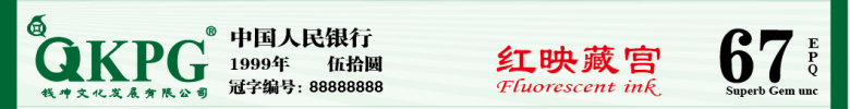 形态特征:红映藏宫是9950背面荧光的又一发现,特征为背面布达拉宫位置上下呈现粉红色荧光油墨,故名“红映藏宫”。经过钱坤评级鉴定组初审, 实物原生,名称符合要求和特点,予以开标。