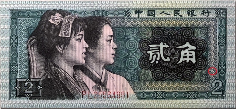 形态特征:第四套人民币8002玉如意品种,其特征为:位于正面右下“2”字左上角卷云花纹上部有一断开十字纹,断开后的卷云纹下部形似中国传统艺术品 玉如意