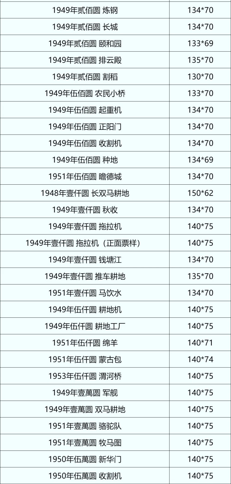 1. 第一套人民币版别繁多,本表仅列常见版别尺寸,部分同面值不同版别尺寸略有差异,以实物为准。